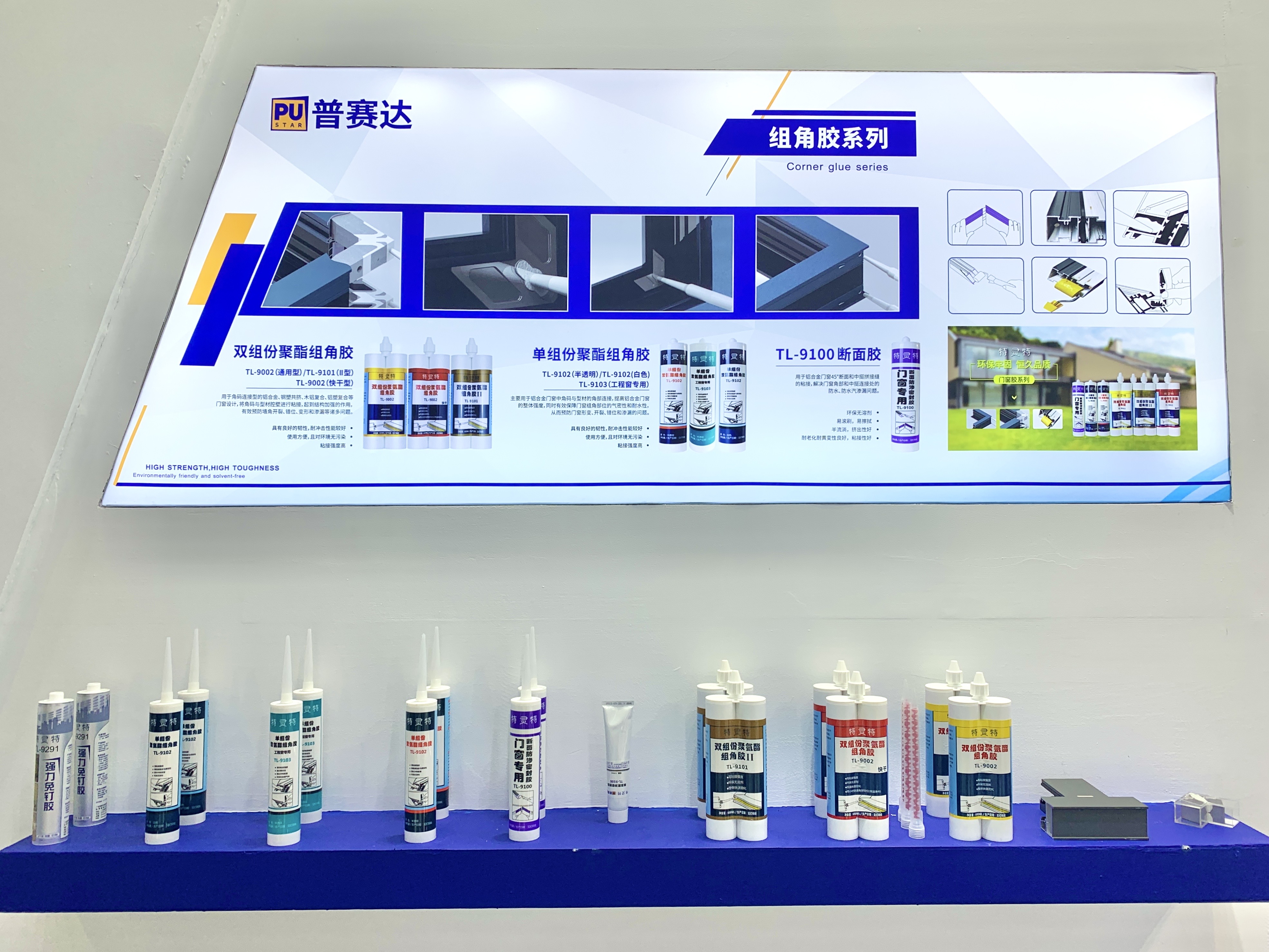 本屆展會(huì),普賽達(dá)攜建筑全系列膠粘劑產(chǎn)品亮相,諸如建筑工程用25LM低模量的改性硅酮密封膠、耐候高性能的聚氨酯密封膠;內(nèi)裝用0級防霉無甲醛的硅酮膠;能夠牢固粘接多種基材的MS膠。除了展示經(jīng)典的建筑系列膠粘劑,鋁門窗專用組角膠的展出也成為了此次展會(huì)的一大亮點(diǎn)。