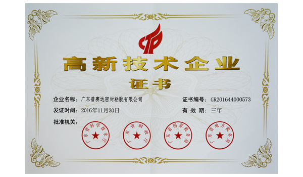近日,公布了《2016年國(guó)家高新技術(shù)企業(yè)復(fù)審結(jié)果》,廣東普賽達(dá)密封粘膠有限公司榜上有名,標(biāo)志著公司順利通過高新復(fù)審,再次被認(rèn)定為高新技術(shù)企業(yè),現(xiàn)已頒發(fā)證書。(證書編號(hào):GR201644000573)