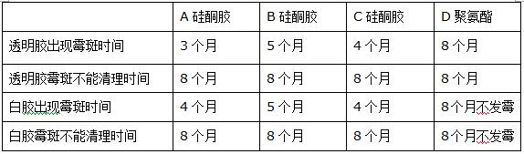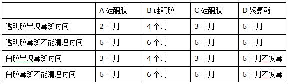 表一:集體飯?zhí)孟赐氤貎?nèi)部聚氨酯防霉膠與硅酮防霉膠防霉性能對(duì)比