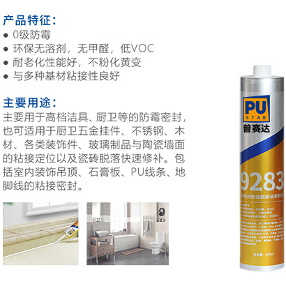 9283 環(huán)保改性硅烷家裝密封膠是一種單組分濕氣固化改性硅烷膠,具有良好的密封性能和內(nèi)聚力,具有防霉功能。對基材無腐蝕、無污染,對環(huán)境無污染,對五金配件、不銹鋼、多數(shù)塑料等多種材料具有良好的粘接性能。