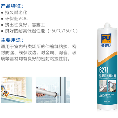 6271 為單組分濕氣固化密封膠,采用中性硅酮膠作為原料, 對(duì)環(huán)境無污染,與金屬、陶瓷、玻璃、石材等多種基材具有良好的密封粘接性能。