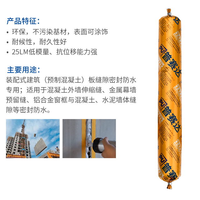 裝配式建筑(預制混凝土)板縫隙密封防水專用;適用于混凝土外墻伸縮縫、金屬幕墻預留縫、鋁合金窗框與混凝土、水泥墻體縫隙等密封防水。
