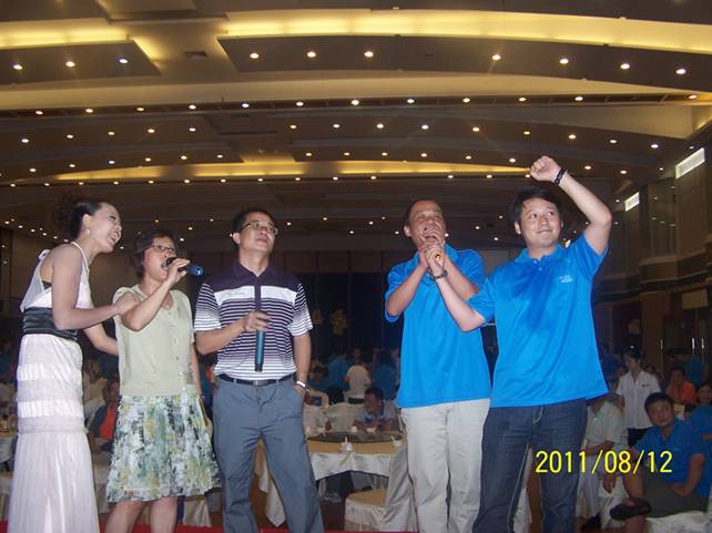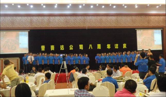第三部分,慶典晚宴。8月12日晚6點(diǎn)慶典晚宴在天天漁村進(jìn)行,總經(jīng)理及嘉賓代表共同開啟生日香檳、切開生日蛋糕。我們普賽達(dá)人與到場(chǎng)約七十位嘉賓舉杯同慶普賽達(dá)8周歲生日。晚宴的高潮部分莫過(guò)于由普賽達(dá)人自編自導(dǎo)的文娛節(jié)目。盡管文娛表演沒有華麗的舞臺(tái)布置及燈光效果,但絲毫沒有影響我們整場(chǎng)晚會(huì)節(jié)目的表現(xiàn)力。節(jié)目首先以公司全員大合唱《不要認(rèn)為自己沒有用》拉開序幕,大合唱激情的表演力感動(dòng)了在場(chǎng)的全體嘉賓;第二個(gè)節(jié)目是資材部極具新意與看點(diǎn)的《產(chǎn)品時(shí)裝秀》表演,自制的道具、恰到好處的臺(tái)詞解說(shuō)及舞臺(tái)動(dòng)作設(shè)計(jì)、夸張的表演獲得了臺(tái)下觀眾一次又一次熱烈的掌聲和歡呼聲,不僅如此,嘉賓沈春林教授還特意上臺(tái)為資材部這個(gè)節(jié)目做了現(xiàn)場(chǎng)采訪,使這個(gè)《產(chǎn)品時(shí)裝秀》真正要表達(dá)的含義植入了觀眾的心底;市場(chǎng)部男女二人合唱《變臉》,其中男生劉輝不似明星卻勝似明星的歌聲再一次把晚會(huì)氣氛推向了高潮,他的歌聲低沉有力、余音繞梁,深深地打動(dòng)了臺(tái)下觀眾的心弦,給我們留下了深刻的印象。